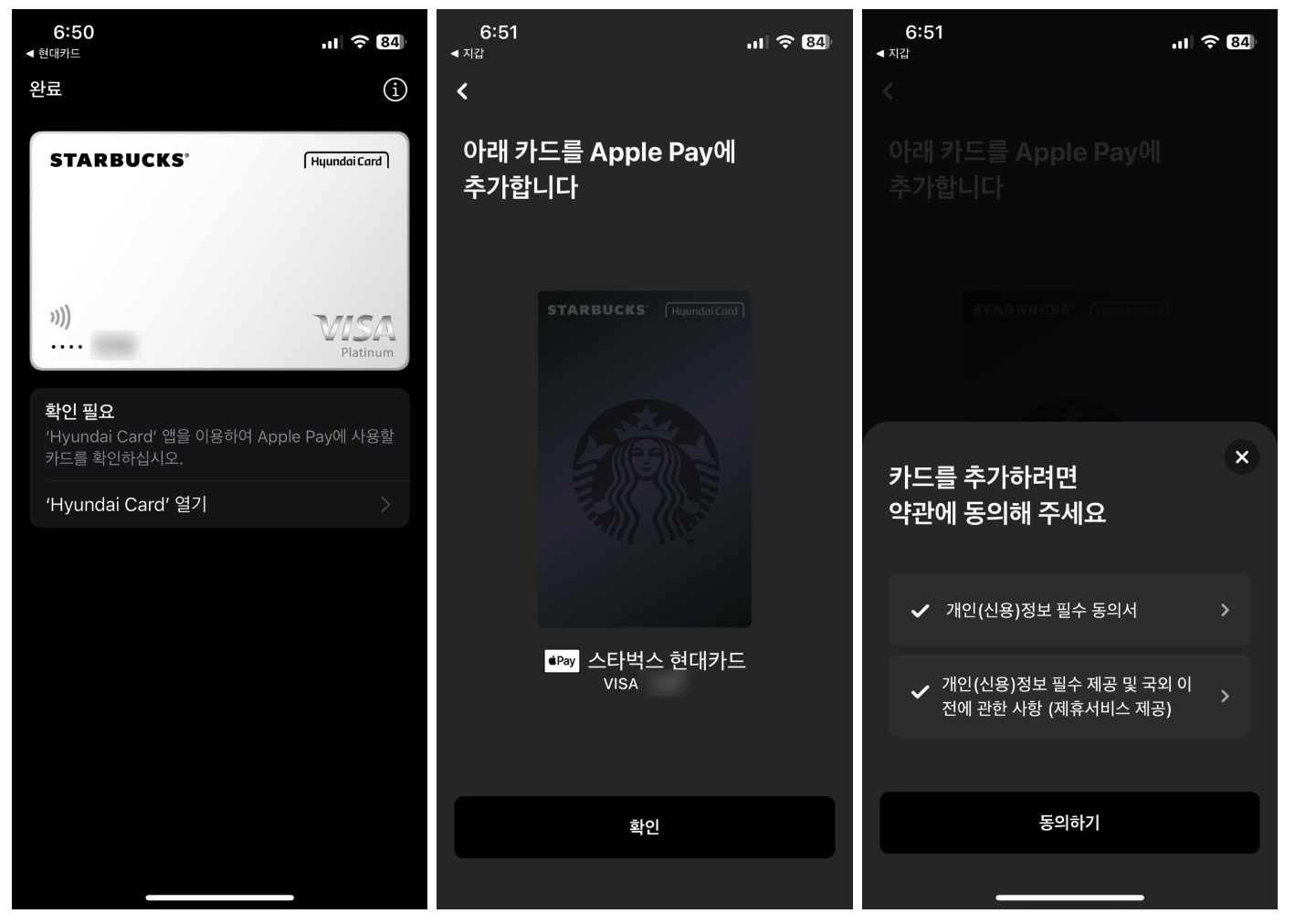 '지갑' 앱에 등록이 완료되었다면, 현대카드 앱(Hyundai Card)과 연결되어야 완료됩니다. 카드 약관에 동의하면 모든 설정이 완료됩니다.