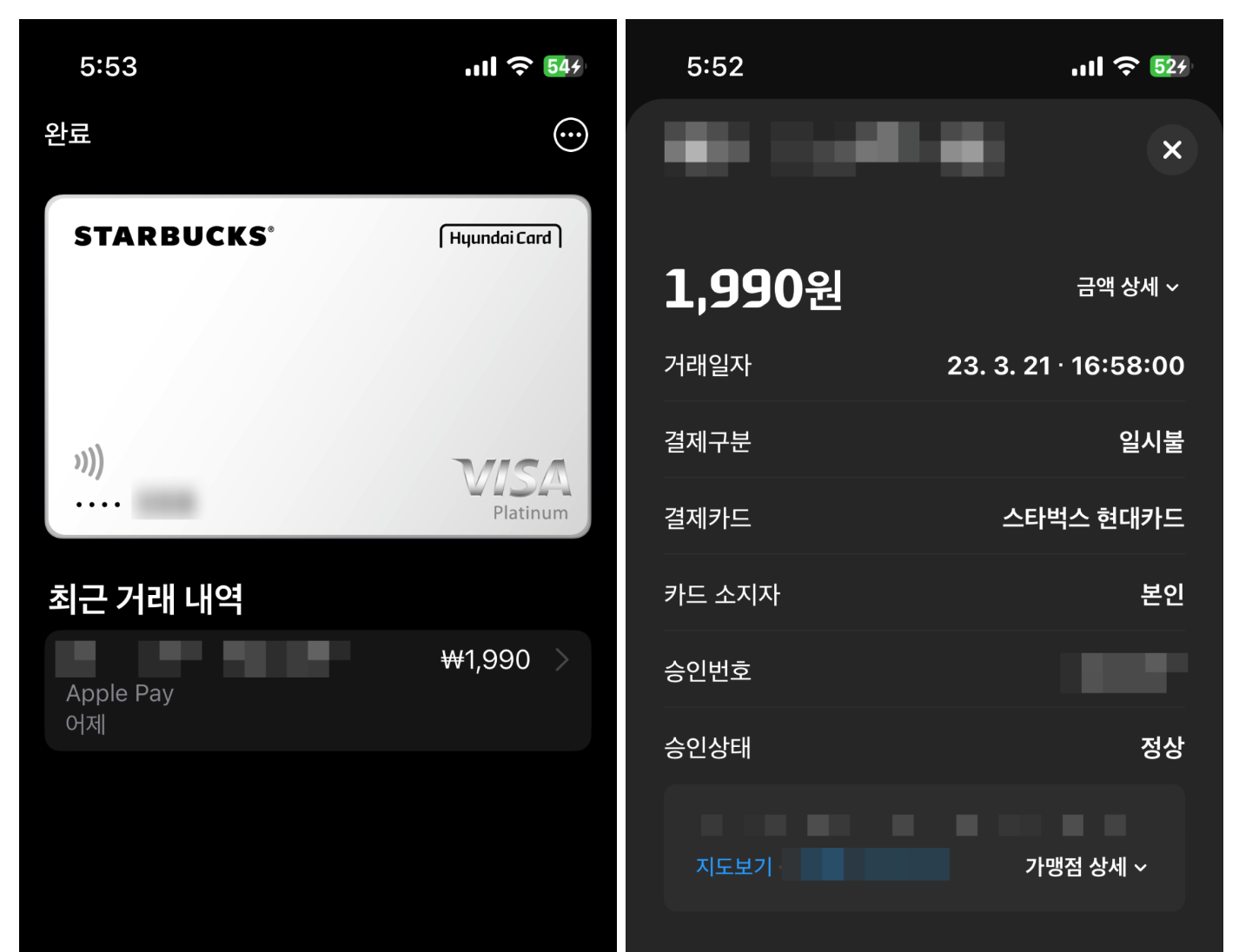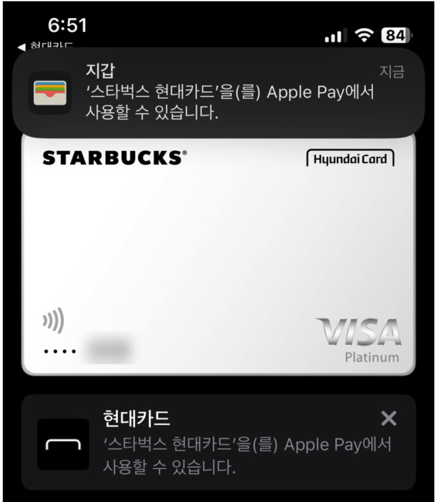 개인적으로 스타벅스 현대카드를 사용하고 있어 자동으로 스타벅스카드에 충전이 되고있어 불편함은 없는 것 같습니다. 신용카드로 직접 스타벅스에서 결제를 한 적이 최근에 거의 없는 것 같습니다. 교통 카드가 되는 메인 카드와 함께 애플페이가 되는 현대카드는 굳이 가지고 다닐 필요가 없으니 서브로 활용하는 것도 좋을 듯 합니다.